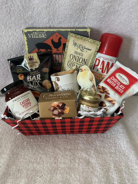 Tucked into this buffalo plaid gift box he'll find such items to get started grilling his favourite protein. Meat shredding claws, gourmet garlic finishing salt with spoon, Pam grilling spray, French onion dip mix, Caesar vodka tomato jam, milk chocolate caramel bites, stone ground mustard, sweet & savory bar mix, & chocolate wafer bites. Great birthday gift!