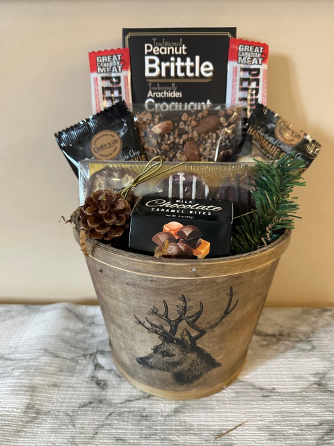 Birthday, new job, new home, whatever the celebration, this gift box is sure to be a hit. Tucked away in this distressed look box he'll find, French onion dip mix, french onion jam, spreader, spoon artisan crisps, Nutz cashew/almond mix, maple sugar candies, red wine dry salami, chocolate covered pretzel rods, & Scrocchi rustic crackers.