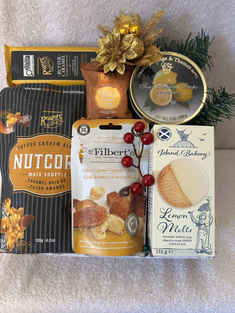 This festive birch design gift box is filled with special treats. Roger's Canadian made butter caramel chocolate bar, Toffee, cashew nut corn, Mr. Filberts salted caramel chocolate & nut snack mix, Scotland's Isle of Mull bakery lemon melts cookies, Cambridge & Thames lemon drops, and Roger's gingerbread cream chocolates. It will be hard to wipe that smile off their faces!!