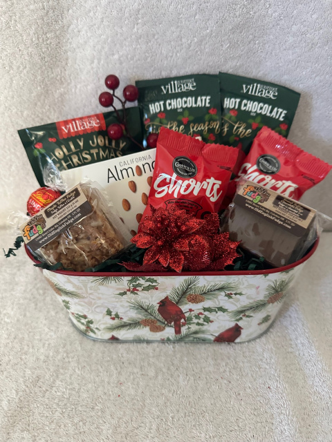 A delicious gift to share or for one. This holiday reusable metal container is loaded with epicurean delights such as, hot chocolates, candies, Lindors, 2 gourmet 1/4 lbs of fudge, a couple of shortbread cookies, and a box of almonds to snack on!...delicious and fun!