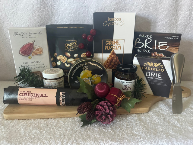 Show up on the big day with this and you will be the hit of the day! This solid wooden extra long serving board is a charcuterie delight. Comes with UK's Fine Cheese Co fig, honey & olive oil crackers, Brie, stainless spreader, brie toppings, caramel corn, salami, jam, gourmet honey, and Rogers nut and chocolate mix.