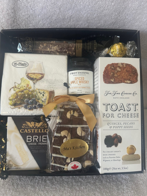 Gourmet curated gift boxes are all the rage this year. This one is one of the reasons why. This deliciousness box contains, Brie, Ma's Kitchen buttercrunch chocolate bar, Provisions jam, Fine Cheese Co. toasts, Lindors & an English toffee chocolate coated biscotti, oh, and cocktail knapkins!