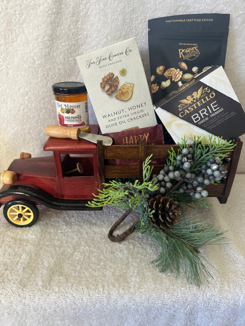 Keepsake wooden truck with moving wheels holds delicious Brie cheese, Hot Mama's red pepper jelly, spreader, Roger's chocolate bar, gourmet nut mix, & UK's Find Cheese Co crackers.