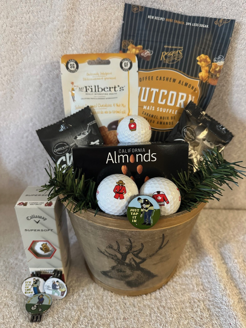 They'll sure to love this fun gift for the nutty golfer on your list. Comes with an assortment of gourmet nuts and cookies. To complete the gift are 3 Callaway golf balls "Canadian" style! Also, for added fun, a ball marker, and hat clip to hold it....on the "Happy Gilmore" theme. Limited quantities, when they are gone they are gone... |