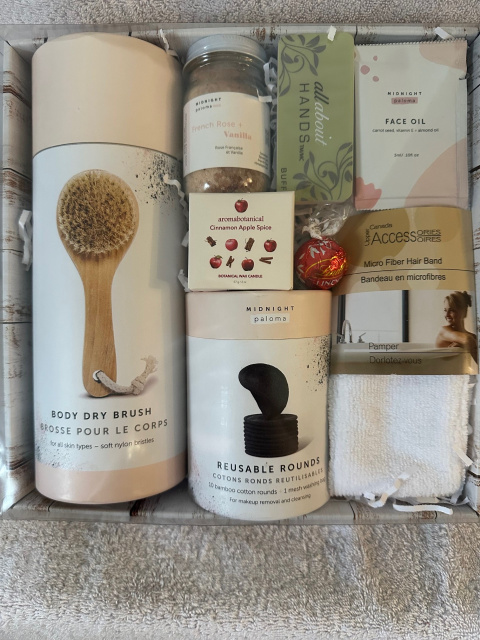 For those who would prefer spa items over chocolate, this gift is for them. This boxed spa gift includes, a microfibre headband, 10 bamboo reusable cotton rounds, a mini candle, body brush, bath salts, face oil, a nail buffer, and a Lindor truffle. Comes wrapped with ribbon and hand tied bow.
