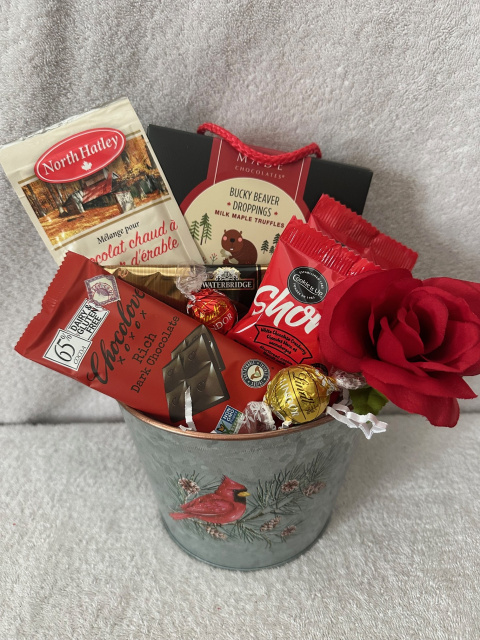 You don't have to break the budget to show you care. This beautiful cardinal tin holds delicious hot chocolate, Waterbridge chocolate bar, Bucky beaver truffles, a dark chocolate bar, a couple of Lindors, & 2 cookie it up shortbreads.