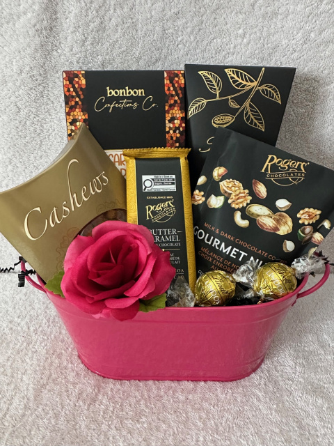 Relax & enjoy delicious treats! Included in this reusable metal container, Lindor truffles, Rogers gourmet chocolate bar, truffles, caramel corn, cashews, & milk & dark chocolate covered gourmet nut mix.